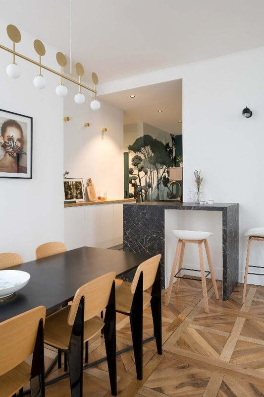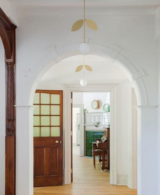 The row pendant is a versatile light. It is based on a minimalist element of two round shapes, the glass globe and the brass disc, placed opposite each other at either end of a delicate tube. As its characteristic is the repetition of its defining element, the row pendant is available a standard version of 7 elements, as well as longer or shorter custom lengths.