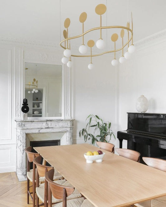 This luxurious chandelier pendant light has 7 opal glass spheres and brass discs placed linearly on an arm. It is a minimalist and modern pendant light that is suitable for living rooms, over kitchen islands and tables. It comes in black, white and brass finishes. This light fitting can be used with standard or dimmable G9 LED bulbs. Made in Germany.